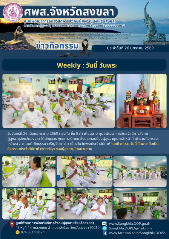 ศูนย์พัฒนาการจัดสวัสดิการสังคมผู้สูงอายุจังหวัดสงขลา ได้เชิญชวนพุทธศาสนิกชน ซึ่งประกอบด้วยผู้สูงอายุและเจ้าหน้าที่ เข้าร่วมกิจกรรมบำเพ็ญกุศล ไหว้พระ สวดมนต์ เจริญจิตภาวนา พร้อมรับฟังบรรยายธรรมสังเขป เนื่องในวันพระจำสัปดาห์