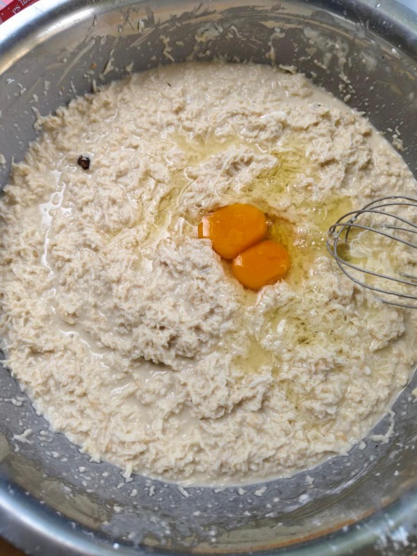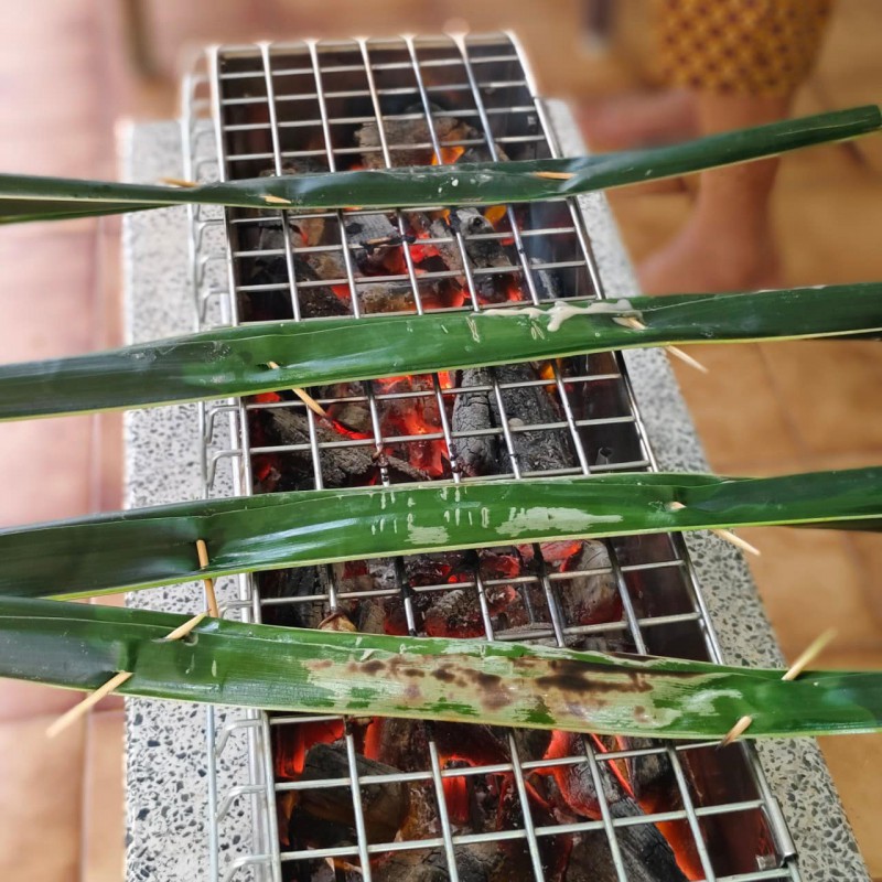 คลุกเคล้าส่วนผสมเข้ากันแล้ว ตักใส่ด้านในของใบมะพร้าวตามยาว ใช้ใบมะพร้าวอีกใบปิดให้มิด กลัดด้วยไม้ กลัดด้านหัว กลาง และท้าย นำไปปิ้งไฟอ่อน ระวังอย่าใช้ไฟแรงจัด เพราะจะทำให้ใบมะพร้าวไหม้ก่อนที่ขนมจะสุก