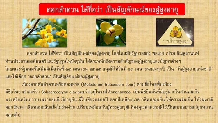 ย้อนไปในเรื่องนี้ คณะรัฐมนตรี มีมติเมื่อวันที่ 14 ธันวาคม 2525 อนุมัติและประกาศให้วันที่ 13 เมษายน ของทุกปีเป็นวันผู้สูงอายุแห่งชาติ และได้เลือกดอกลำดวน เป็นสัญลักษณ์ของผู้สูงอายุ