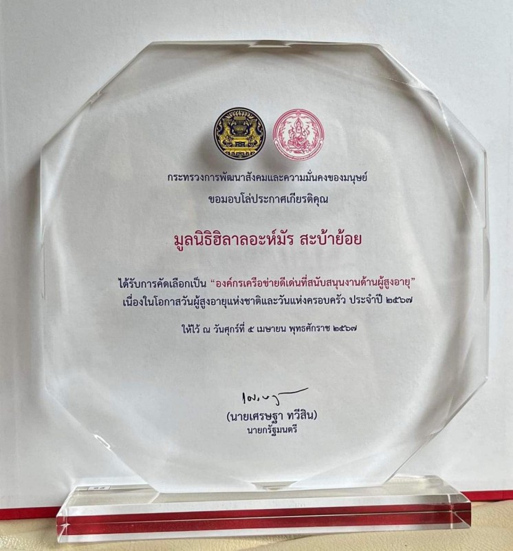 ในงานวันผู้สูงอายุแห่งชาติ ประจำปี 2567 เมื่อวันที่ 5 เมษายน 2567 มูลนิธิฮิลาลอะห์มัร สะบ้าย้อย เข้ารับโล่ประกาศเกียรติคุณ ในโอกาสที่ได้รับการคัดเลือกเป็นองค์กรเครือข่ายดีเด่นที่สนับสนุนงานด้านผู้สูงอายุ