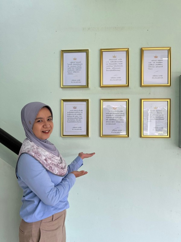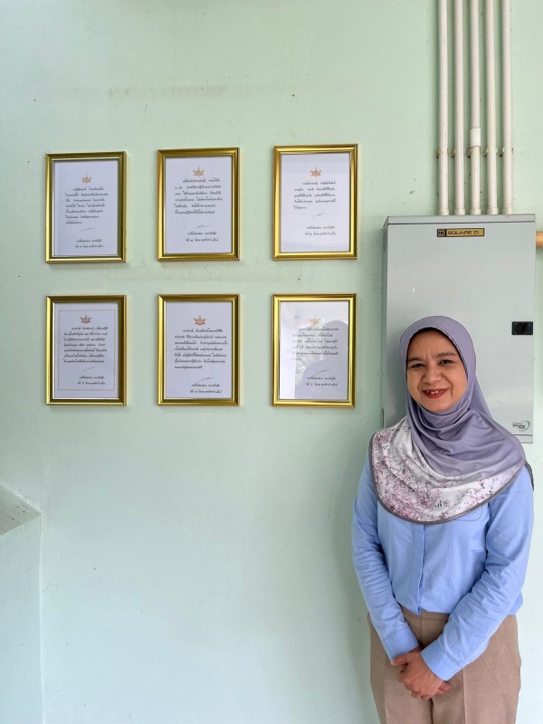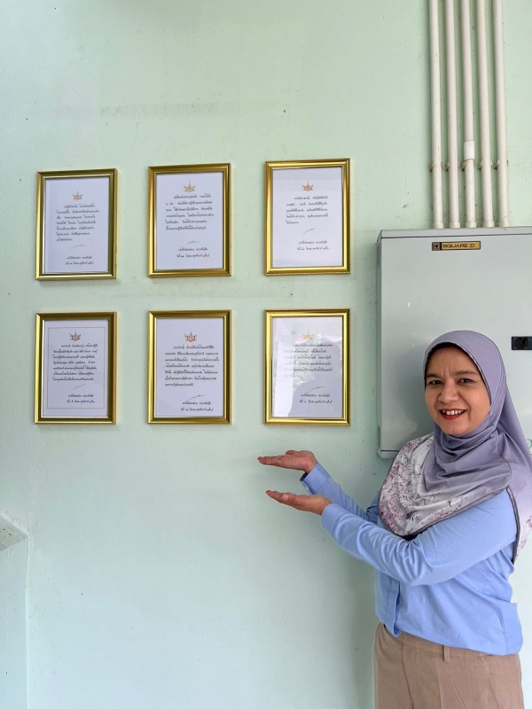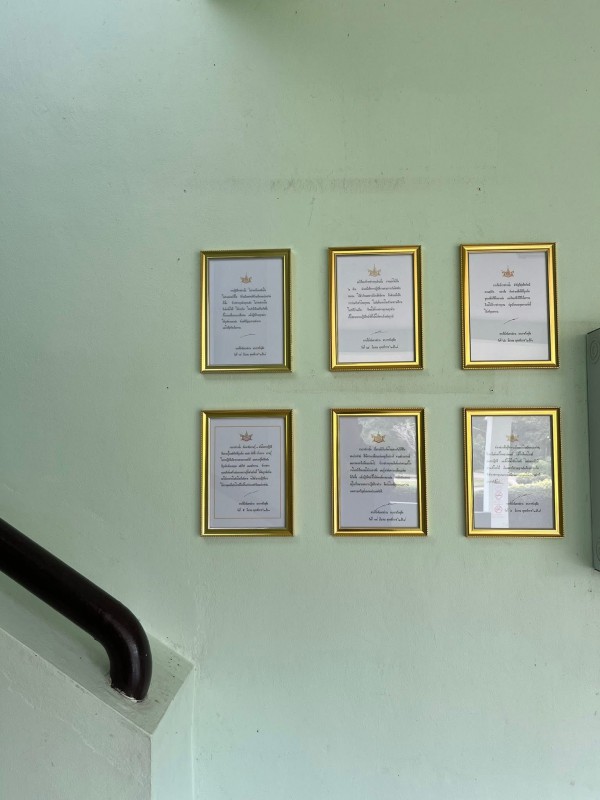 ประดับไว้บริเวณชั้นล่างอาคารสำนักงาน ทางขึ้นชั้นบน เพื่อให้บุคลากรได้น้อมนำ - หยุดมองขวาก่อนขึ้นไปลงชื่อเข้างาน