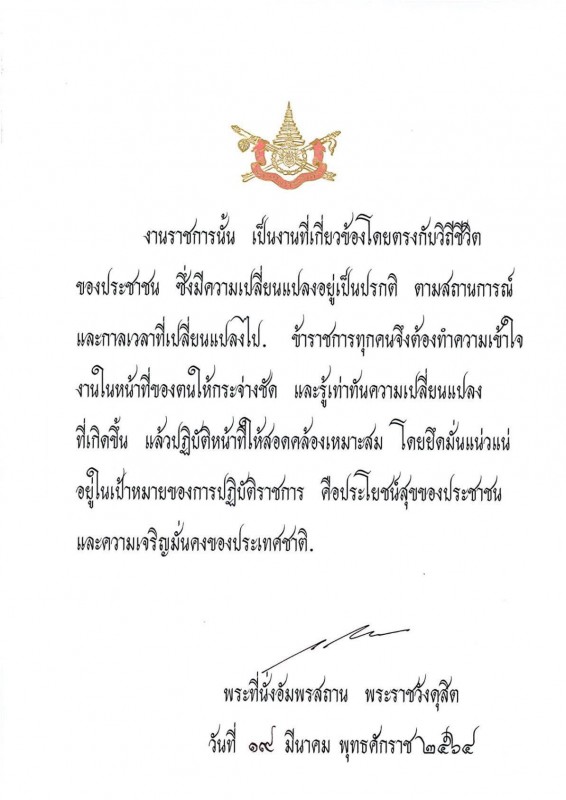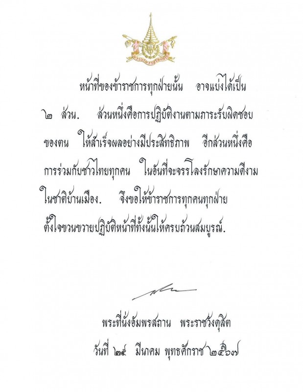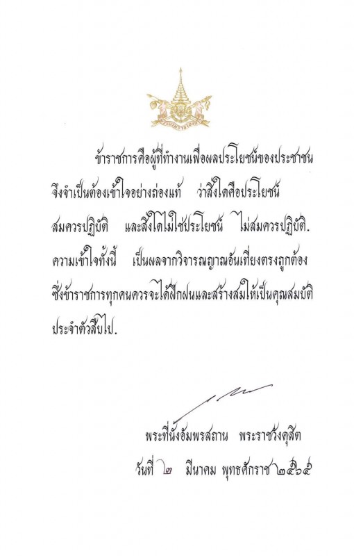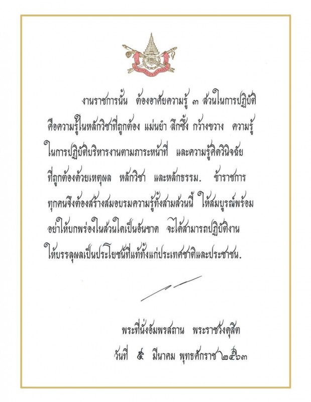 พระบรมราโชวาท พระบาทสมเด็จพระเจ้าอยู่หัว ที่พระราชทานแก่ข้าราชการพลเรือน เนื่องในวันข้าราชการพลเรือนประจำปี เป็นสิ่งที่ได้น้อมนำ