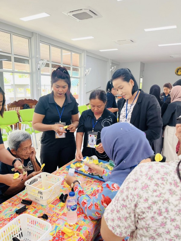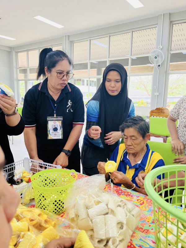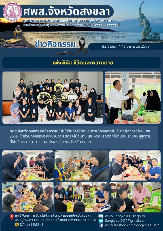 วันอังคารที่ 17 กุมภาพันธ์ 2569 ศพส.จังหวัดสงขลา จัดกิจกรรมให้ผู้เข้ารับการฝึกอบรมตามโครงการผู้บริบาลผู้สูงอายุในชุมชน ประจำปีงบประมาณ พ.ศ. 2569 เข้าร่วมกิจกรรมสนทนา "เพ่งพินิจ ชีวิตและความตาย" นับแต่การดูแลผู้สูงอายุระยะท้าย ระบบสถานชีวาภิบาลภายในหน่วยงาน และกิจกรรมอาชีวบำบัดที่เกี่ยวเนื่องกับความตาย ได้แก่ การผลิตดอกไม้จันทน์และพวงหรีด เพื่อใช้ในงานฌาปนกิจศพของชาวพุทธในวิถีไทย ร่วมกับผู้สูงอายุที่ใช้บริการ ณ อาคารอเนกประสงค์ ศพส.จังหวัดสงขลา