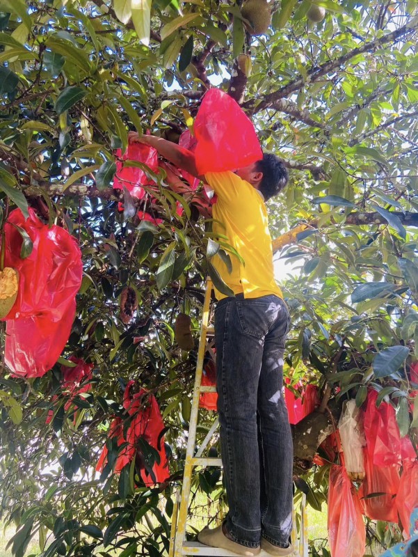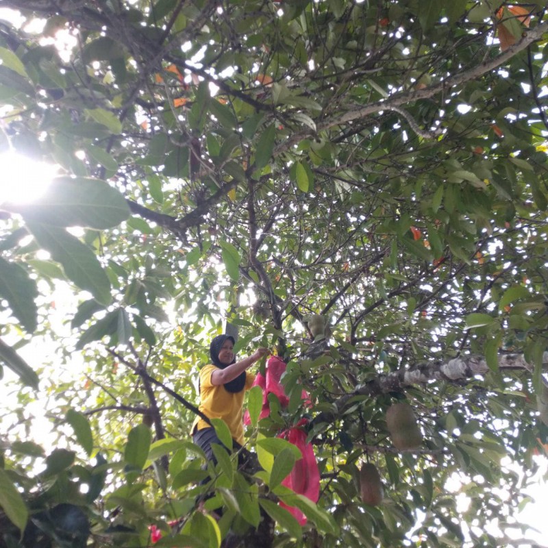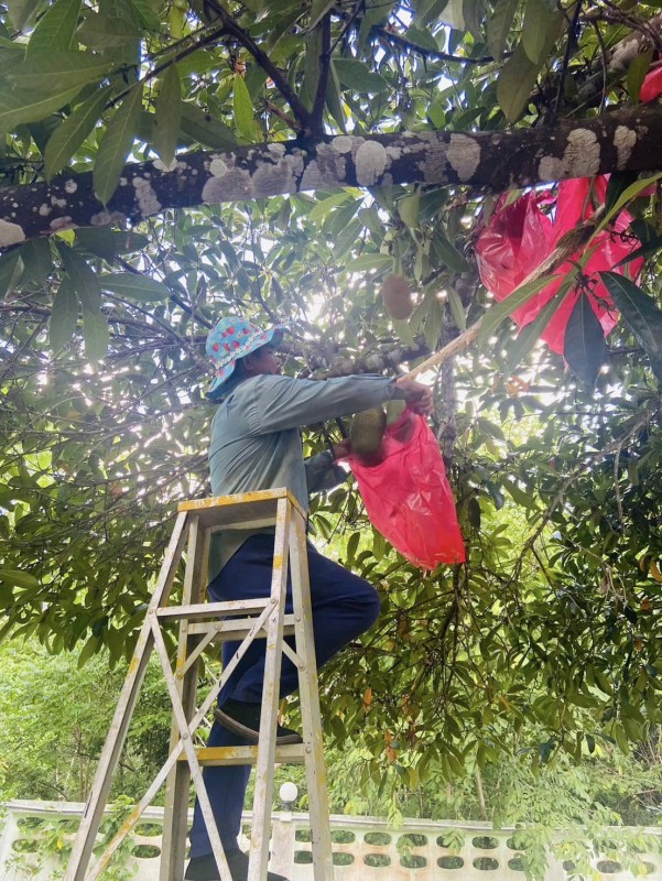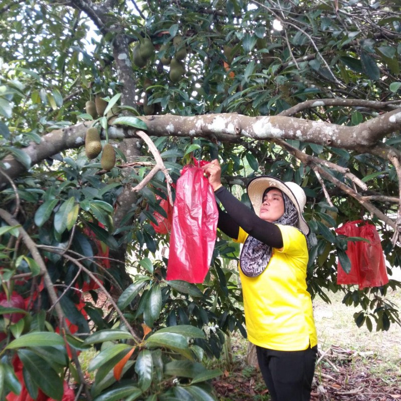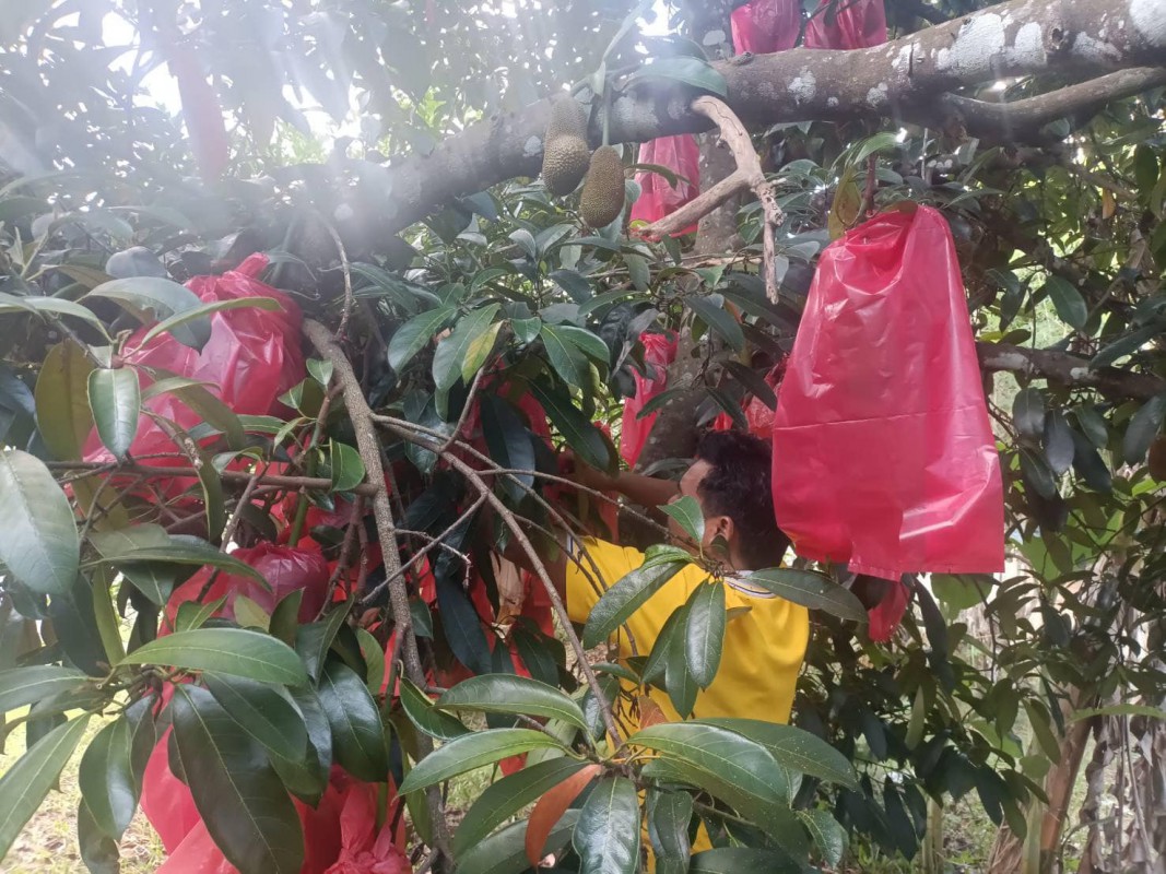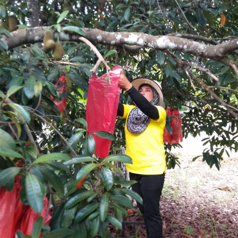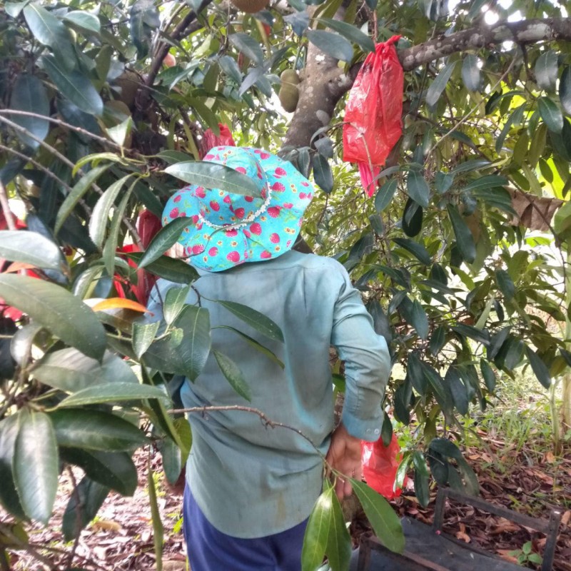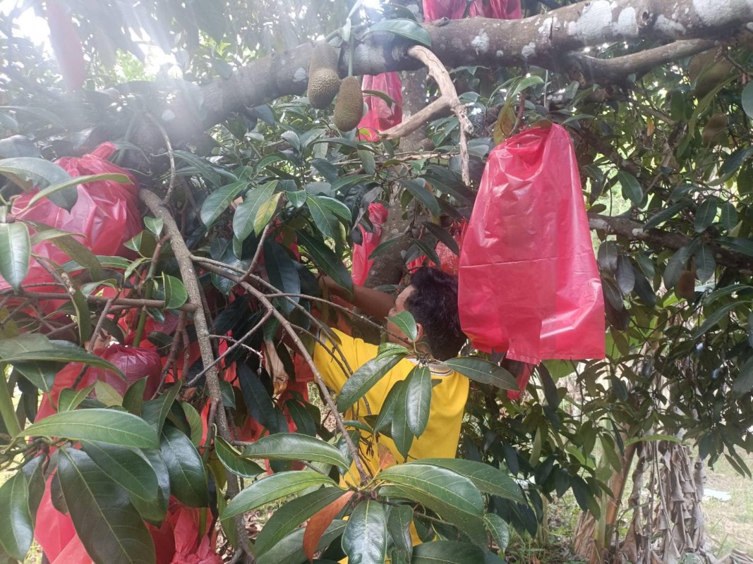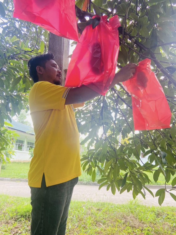 เพื่อให้ได้ผลสวยงาม วันนี้ พี่น้องชาวสวน (เลิกงานก่อนกลับบ้าน) จึงจำเป็นต้องช่วยกันห่อ ป้องกันแมลง กระรอก - ห่อด้วยกระดาษหนังสือพิมพ์บ้าง ถุงพลาสติกบ้าง กระทั่งใช้ใบสิเหรงสานเป็นตะกร้อห่อลูกจำปาดะ ดังที่ทำกันเมื่อปีที่ผ่านมา