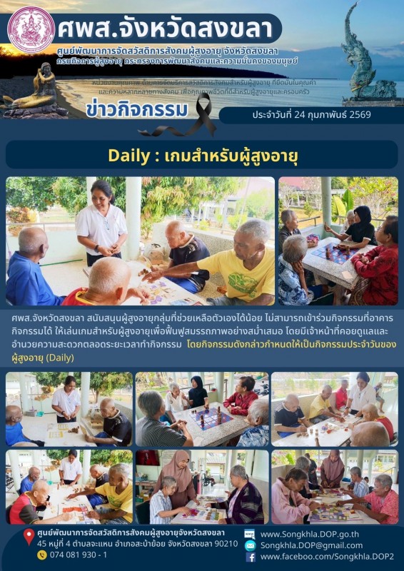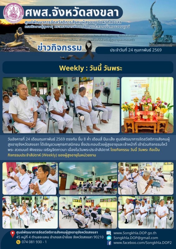 ศพส.จังหวัดสงขลา ขอรายงานกิจกรรม ประจำวันที่ 24 กุมภาพันธ์ 2569 จำนวน 7 กิจกรรม ดังนี้