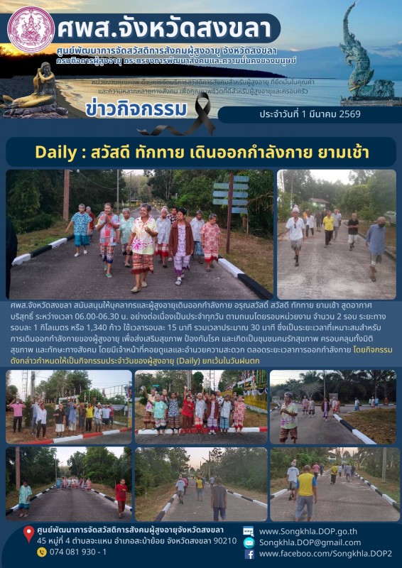 ศพส.จังหวัดสงขลา ขอรายงานกิจกรรม ประจำวันที่ 1 มีนาคม 2569 จำนวน 2 กิจกรรม ดังนี้